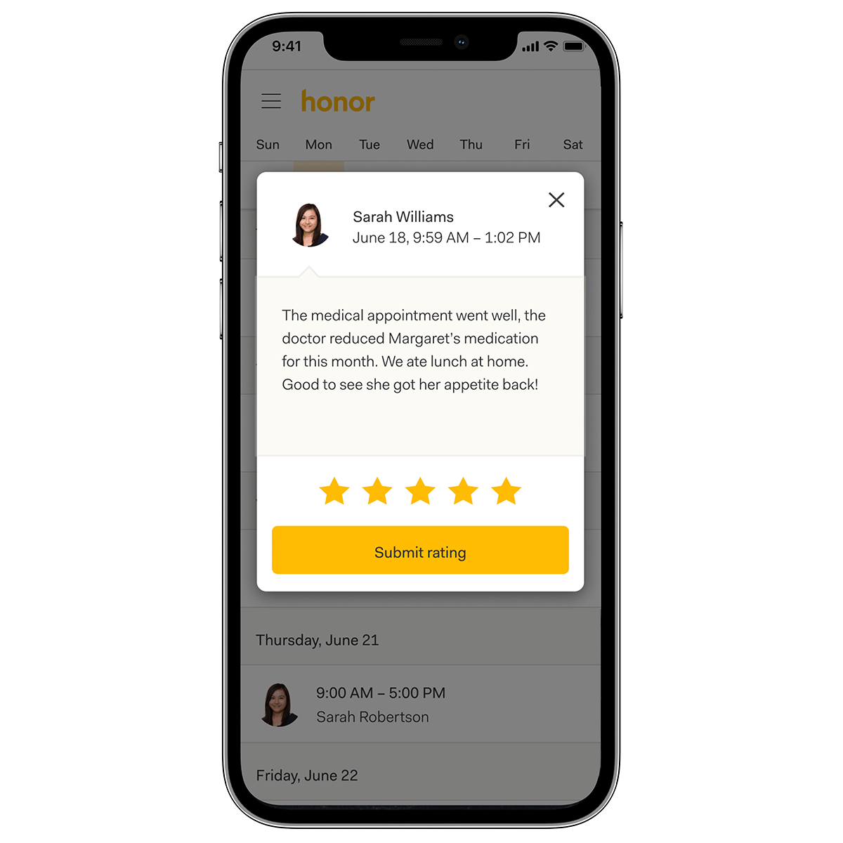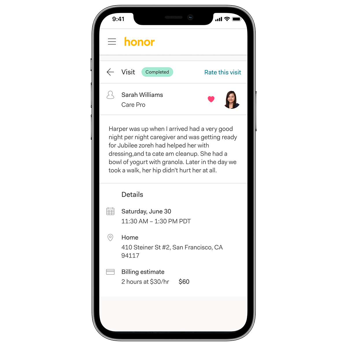 The Honor Family App lets you know who’s coming to the house for a care visit, exactly when they arrive and leave, and what tasks have been completed. It’s never been easier to manage care and companionship. If you or a loved one is an existing Honor Client, download the app to stay in touch and informed.